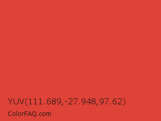 YUV 111.689,-27.948,97.62 Color is a normal red color and the nearest color is Cinnabar #e34234. Hex code #df4237 and RGB value is rgb(223,66,55). In RGB color space, this color is composed of 87% red, 26% green, 22% blue, In CMYK color space, this color is composed of 0% cyan, 70% magenta, 75% yellow , 13% black , In HSL color space, this color has a hue angle of 4° , 72% saturation and 55% lightness.
