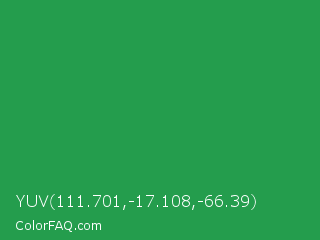 YUV 111.701,-17.108,-66.39 Color is a normal green color and the nearest color is Sea Green #2e8b57. Hex code #249d4d and RGB value is rgb(36,157,77). In RGB color space, this color is composed of 14% red, 62% green, 30% blue, In CMYK color space, this color is composed of 77% cyan, 0% magenta, 51% yellow , 38% black , In HSL color space, this color has a hue angle of 140° , 63% saturation and 38% lightness.