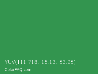 YUV 111.718,-16.13,-53.25 Color is a normal green color and the nearest color is Sea Green #2e8b57. Hex code #33954f and RGB value is rgb(51,149,79). In RGB color space, this color is composed of 20% red, 58% green, 31% blue, In CMYK color space, this color is composed of 66% cyan, 0% magenta, 47% yellow , 42% black , In HSL color space, this color has a hue angle of 137° , 49% saturation and 39% lightness.