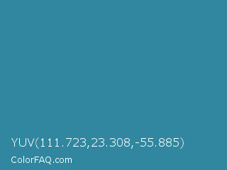 YUV 111.723,23.308,-55.885 Color is a normal cyan color and the nearest color is Astral #327da0. Hex code #30879f and RGB value is rgb(48,135,159). In RGB color space, this color is composed of 19% red, 53% green, 62% blue, In CMYK color space, this color is composed of 70% cyan, 15% magenta, 0% yellow , 38% black , In HSL color space, this color has a hue angle of 193° , 54% saturation and 41% lightness.