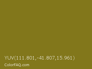YUV 111.801,-41.807,15.961 Color is a normal yellow color and the nearest color is Pacifika #778120. Hex code #82771b and RGB value is rgb(130,119,27). In RGB color space, this color is composed of 51% red, 47% green, 11% blue, In CMYK color space, this color is composed of 0% cyan, 8% magenta, 79% yellow , 49% black , In HSL color space, this color has a hue angle of 54° , 66% saturation and 31% lightness.
