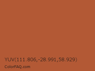 YUV 111.806,-28.991,58.929 Color is a normal orange color and the nearest color is Brown Rust #af593e. Hex code #b35935 and RGB value is rgb(179,89,53). In RGB color space, this color is composed of 70% red, 35% green, 21% blue, In CMYK color space, this color is composed of 0% cyan, 50% magenta, 70% yellow , 30% black , In HSL color space, this color has a hue angle of 17° , 54% saturation and 45% lightness.