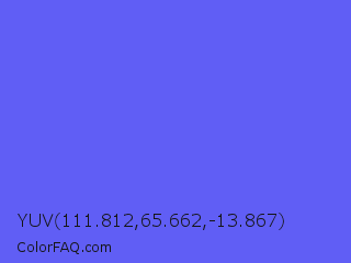 YUV 111.812,65.662,-13.867 Color is a light indigo color and the nearest color is Very Light Blue #6666ff. Hex code #605ef5 and RGB value is rgb(96,94,245). In RGB color space, this color is composed of 38% red, 37% green, 96% blue, In CMYK color space, this color is composed of 61% cyan, 62% magenta, 0% yellow , 4% black , In HSL color space, this color has a hue angle of 241° , 88% saturation and 66% lightness.