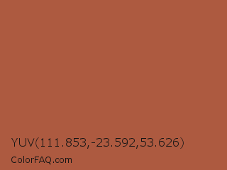 YUV 111.853,-23.592,53.626 Color is a normal red color and the nearest color is Brown Rust #af593e. Hex code #ad5a40 and RGB value is rgb(173,90,64). In RGB color space, this color is composed of 68% red, 35% green, 25% blue, In CMYK color space, this color is composed of 0% cyan, 48% magenta, 63% yellow , 32% black , In HSL color space, this color has a hue angle of 14° , 46% saturation and 46% lightness.