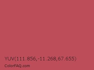 YUV 111.856,-11.268,67.655 Color is a normal red color and the nearest color is Bittersweet Shimmer #bf4f51. Hex code #bd4d59 and RGB value is rgb(189,77,89). In RGB color space, this color is composed of 74% red, 30% green, 35% blue, In CMYK color space, this color is composed of 0% cyan, 59% magenta, 53% yellow , 26% black , In HSL color space, this color has a hue angle of 354° , 46% saturation and 52% lightness.
