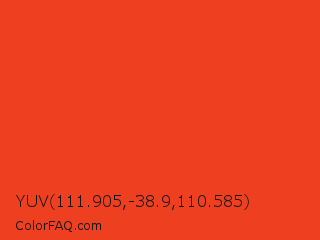 YUV 111.905,-38.9,110.585 Color is a normal red color and the nearest color is Pomegranate #f34723. Hex code #ee3f21 and RGB value is rgb(238,63,33). In RGB color space, this color is composed of 93% red, 25% green, 13% blue, In CMYK color space, this color is composed of 0% cyan, 74% magenta, 86% yellow , 7% black , In HSL color space, this color has a hue angle of 9° , 86% saturation and 53% lightness.