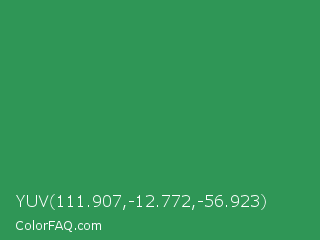 YUV 111.907,-12.772,-56.923 Color is a normal green color and the nearest color is Sea Green #2e8b57. Hex code #2f9656 and RGB value is rgb(47,150,86). In RGB color space, this color is composed of 18% red, 59% green, 34% blue, In CMYK color space, this color is composed of 69% cyan, 0% magenta, 43% yellow , 41% black , In HSL color space, this color has a hue angle of 143° , 52% saturation and 39% lightness.