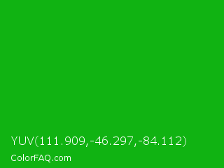 YUV 111.909,-46.297,-84.112 Color is a normal green color and the nearest color is Slimy Green #299617. Hex code #10b312 and RGB value is rgb(16,179,18). In RGB color space, this color is composed of 6% red, 70% green, 7% blue, In CMYK color space, this color is composed of 91% cyan, 0% magenta, 90% yellow , 30% black , In HSL color space, this color has a hue angle of 121° , 84% saturation and 38% lightness.