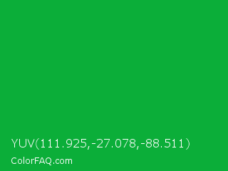 YUV 111.925,-27.078,-88.511 Color is a normal green color and the nearest color is Green Pantone #00ad43. Hex code #0bae39 and RGB value is rgb(11,174,57). In RGB color space, this color is composed of 4% red, 68% green, 22% blue, In CMYK color space, this color is composed of 94% cyan, 0% magenta, 67% yellow , 32% black , In HSL color space, this color has a hue angle of 137° , 88% saturation and 36% lightness.