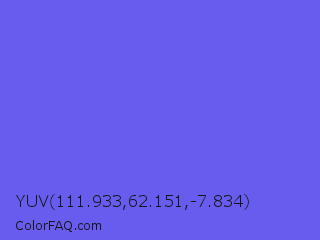 YUV 111.933,62.151,-7.834 Color is a light indigo color and the nearest color is Very Light Blue #6666ff. Hex code #675cee and RGB value is rgb(103,92,238). In RGB color space, this color is composed of 40% red, 36% green, 93% blue, In CMYK color space, this color is composed of 57% cyan, 61% magenta, 0% yellow , 7% black , In HSL color space, this color has a hue angle of 245° , 81% saturation and 65% lightness.