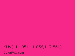 YUV 111.951,11.856,117.561 Color is a normal rose color and the nearest color is Wild Strawberry Crayola #ff3399. Hex code #f62788 and RGB value is rgb(246,39,136). In RGB color space, this color is composed of 96% red, 15% green, 53% blue, In CMYK color space, this color is composed of 0% cyan, 84% magenta, 45% yellow , 4% black , In HSL color space, this color has a hue angle of 332° , 92% saturation and 56% lightness.