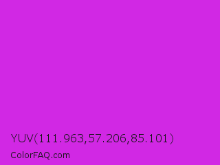 YUV 111.963,57.206,85.101 Color is a normal magenta color and the nearest color is Steel Pink #cc33cc. Hex code #d128e4 and RGB value is rgb(209,40,228). In RGB color space, this color is composed of 82% red, 16% green, 89% blue, In CMYK color space, this color is composed of 8% cyan, 82% magenta, 0% yellow , 11% black , In HSL color space, this color has a hue angle of 294° , 78% saturation and 53% lightness.