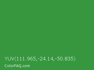 YUV 111.965,-24.14,-50.835 Color is a normal green color and the nearest color is May Green #4c9141. Hex code #36973f and RGB value is rgb(54,151,63). In RGB color space, this color is composed of 21% red, 59% green, 25% blue, In CMYK color space, this color is composed of 64% cyan, 0% magenta, 58% yellow , 41% black , In HSL color space, this color has a hue angle of 126° , 47% saturation and 40% lightness.