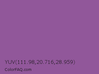 YUV 111.98,20.716,28.959 Color is a normal magenta color and the nearest color is Trendy Pink #8c6495. Hex code #91579a and RGB value is rgb(145,87,154). In RGB color space, this color is composed of 57% red, 34% green, 60% blue, In CMYK color space, this color is composed of 6% cyan, 44% magenta, 0% yellow , 40% black , In HSL color space, this color has a hue angle of 292° , 28% saturation and 47% lightness.