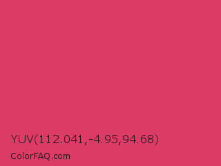 YUV 112.041,-4.95,94.68 Color is a normal rose color and the nearest color is Cerise Red #de3163. Hex code #dc3b66 and RGB value is rgb(220,59,102). In RGB color space, this color is composed of 86% red, 23% green, 40% blue, In CMYK color space, this color is composed of 0% cyan, 73% magenta, 54% yellow , 14% black , In HSL color space, this color has a hue angle of 344° , 70% saturation and 55% lightness.