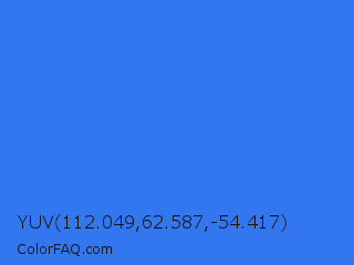 YUV 112.049,62.587,-54.417 Color is a normal blue color and the nearest color is Bleu De France #318ce7. Hex code #3277ef and RGB value is rgb(50,119,239). In RGB color space, this color is composed of 20% red, 47% green, 94% blue, In CMYK color space, this color is composed of 79% cyan, 50% magenta, 0% yellow , 6% black , In HSL color space, this color has a hue angle of 218° , 86% saturation and 57% lightness.