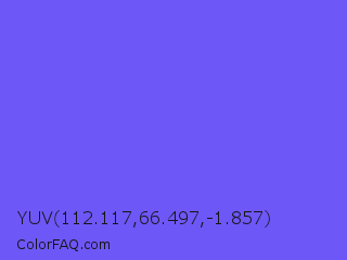 YUV 112.117,66.497,-1.857 Color is a light indigo color and the nearest color is Very Light Blue #6666ff. Hex code #6e57f7 and RGB value is rgb(110,87,247). In RGB color space, this color is composed of 43% red, 34% green, 97% blue, In CMYK color space, this color is composed of 55% cyan, 65% magenta, 0% yellow , 3% black , In HSL color space, this color has a hue angle of 249° , 91% saturation and 65% lightness.