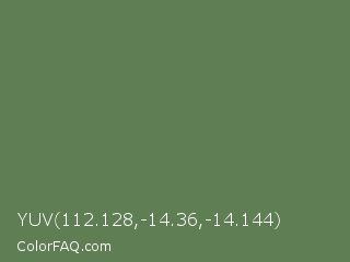 YUV 112.128,-14.36,-14.144 Color is a normal green color and the nearest color is Glade Green #61845f. Hex code #607e53 and RGB value is rgb(96,126,83). In RGB color space, this color is composed of 38% red, 49% green, 33% blue, In CMYK color space, this color is composed of 24% cyan, 0% magenta, 34% yellow , 51% black , In HSL color space, this color has a hue angle of 102° , 21% saturation and 41% lightness.