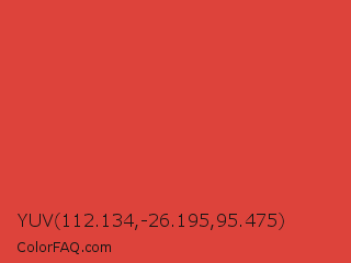 YUV 112.134,-26.195,95.475 Color is a normal red color and the nearest color is Valencia #d84437. Hex code #dd433b and RGB value is rgb(221,67,59). In RGB color space, this color is composed of 87% red, 26% green, 23% blue, In CMYK color space, this color is composed of 0% cyan, 70% magenta, 73% yellow , 13% black , In HSL color space, this color has a hue angle of 3° , 70% saturation and 55% lightness.