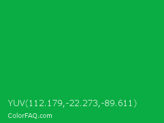 YUV 112.179,-22.273,-89.611 Color is a normal green color and the nearest color is Green Pantone #00ad43. Hex code #0aad43 and RGB value is rgb(10,173,67). In RGB color space, this color is composed of 4% red, 68% green, 26% blue, In CMYK color space, this color is composed of 94% cyan, 0% magenta, 61% yellow , 32% black , In HSL color space, this color has a hue angle of 141° , 89% saturation and 36% lightness.