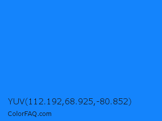 YUV 112.192,68.925,-80.852 Color is a normal blue color and the nearest color is Dodger Blue #1e90ff. Hex code #1484fc and RGB value is rgb(20,132,252). In RGB color space, this color is composed of 8% red, 52% green, 99% blue, In CMYK color space, this color is composed of 92% cyan, 48% magenta, 0% yellow , 1% black , In HSL color space, this color has a hue angle of 211° , 97% saturation and 53% lightness.