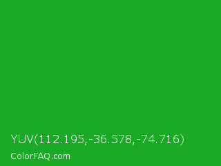 YUV 112.195,-36.578,-74.716 Color is a normal green color and the nearest color is Slimy Green #299617. Hex code #1baa26 and RGB value is rgb(27,170,38). In RGB color space, this color is composed of 11% red, 67% green, 15% blue, In CMYK color space, this color is composed of 84% cyan, 0% magenta, 78% yellow , 33% black , In HSL color space, this color has a hue angle of 125° , 73% saturation and 39% lightness.