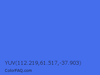 YUV 112.219,61.517,-37.903 Color is a normal blue color and the nearest color is Ultramarine Blue #4166f5. Hex code #456eed and RGB value is rgb(69,110,237). In RGB color space, this color is composed of 27% red, 43% green, 93% blue, In CMYK color space, this color is composed of 71% cyan, 54% magenta, 0% yellow , 7% black , In HSL color space, this color has a hue angle of 225° , 82% saturation and 60% lightness.