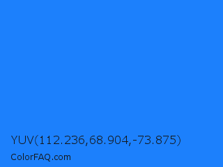 YUV 112.236,68.904,-73.875 Color is a normal blue color and the nearest color is Blue Crayola #1f75fe. Hex code #1c80fc and RGB value is rgb(28,128,252). In RGB color space, this color is composed of 11% red, 50% green, 99% blue, In CMYK color space, this color is composed of 89% cyan, 49% magenta, 0% yellow , 1% black , In HSL color space, this color has a hue angle of 213° , 97% saturation and 55% lightness.