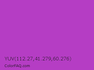 YUV 112.27,41.279,60.276 Color is a normal magenta color and the nearest color is Fuchsia Pink #c154c1. Hex code #b53dc4 and RGB value is rgb(181,61,196). In RGB color space, this color is composed of 71% red, 24% green, 77% blue, In CMYK color space, this color is composed of 8% cyan, 69% magenta, 0% yellow , 23% black , In HSL color space, this color has a hue angle of 293° , 53% saturation and 50% lightness.