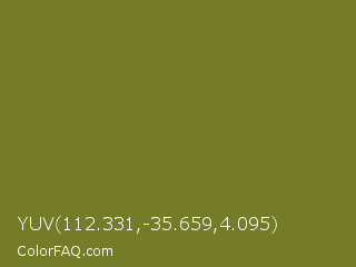 YUV 112.331,-35.659,4.095 Color is a normal yellow color and the nearest color is Crete #737829. Hex code #757c28 and RGB value is rgb(117,124,40). In RGB color space, this color is composed of 46% red, 49% green, 16% blue, In CMYK color space, this color is composed of 6% cyan, 0% magenta, 68% yellow , 51% black , In HSL color space, this color has a hue angle of 65° , 51% saturation and 32% lightness.