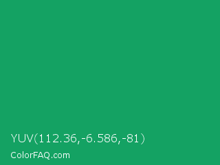 YUV 112.36,-6.586,-81 Color is a normal green color and the nearest color is Green Haze #01a368. Hex code #14a263 and RGB value is rgb(20,162,99). In RGB color space, this color is composed of 8% red, 64% green, 39% blue, In CMYK color space, this color is composed of 88% cyan, 0% magenta, 39% yellow , 36% black , In HSL color space, this color has a hue angle of 153° , 78% saturation and 36% lightness.