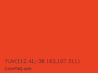 YUV 112.41,-38.163,107.511 Color is a normal red color and the nearest color is Pomegranate #f34723. Hex code #eb4123 and RGB value is rgb(235,65,35). In RGB color space, this color is composed of 92% red, 25% green, 14% blue, In CMYK color space, this color is composed of 0% cyan, 72% magenta, 85% yellow , 8% black , In HSL color space, this color has a hue angle of 9° , 83% saturation and 53% lightness.