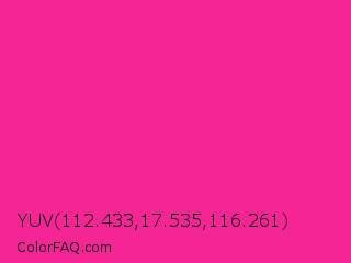 YUV 112.433,17.535,116.261 Color is a normal rose color and the nearest color is Persian Rose #fe28a2. Hex code #f52694 and RGB value is rgb(245,38,148). In RGB color space, this color is composed of 96% red, 15% green, 58% blue, In CMYK color space, this color is composed of 0% cyan, 84% magenta, 40% yellow , 4% black , In HSL color space, this color has a hue angle of 328° , 91% saturation and 55% lightness.