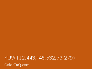 YUV 112.443,-48.532,73.279 Color is a normal orange color and the nearest color is Alloy Orange #c46210. Hex code #c4590e and RGB value is rgb(196,89,14). In RGB color space, this color is composed of 77% red, 35% green, 5% blue, In CMYK color space, this color is composed of 0% cyan, 55% magenta, 93% yellow , 23% black , In HSL color space, this color has a hue angle of 25° , 87% saturation and 41% lightness.