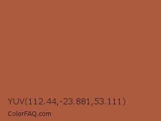 YUV 112.44,-23.881,53.111 Color is a normal color and the nearest color is Brown Rust #af593e. Hex code #ad5b40 and RGB value is rgb(173,91,64). In RGB color space, this color is composed of 68% red, 36% green, 25% blue, In CMYK color space, this color is composed of 0% cyan, 47% magenta, 63% yellow , 32% black , In HSL color space, this color has a hue angle of 15° , 46% saturation and 46% lightness.