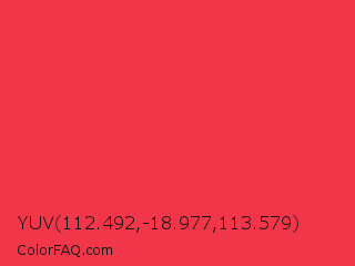 YUV 112.492,-18.977,113.579 Color is a normal red color and the nearest color is Red Salsa #fd3a4a. Hex code #f2364a and RGB value is rgb(242,54,74). In RGB color space, this color is composed of 95% red, 21% green, 29% blue, In CMYK color space, this color is composed of 0% cyan, 78% magenta, 69% yellow , 5% black , In HSL color space, this color has a hue angle of 354° , 88% saturation and 58% lightness.