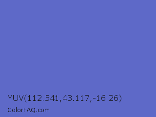 YUV 112.541,43.117,-16.26 Color is a normal blue color and the nearest color is Indigo #4f69c6. Hex code #5e69c8 and RGB value is rgb(94,105,200). In RGB color space, this color is composed of 37% red, 41% green, 78% blue, In CMYK color space, this color is composed of 53% cyan, 48% magenta, 0% yellow , 22% black , In HSL color space, this color has a hue angle of 234° , 49% saturation and 58% lightness.