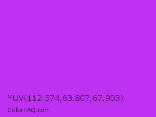 YUV 112.574,63.807,67.903 Color is a normal purple color and the nearest color is Veronica #a020f0. Hex code #be30f2 and RGB value is rgb(190,48,242). In RGB color space, this color is composed of 75% red, 19% green, 95% blue, In CMYK color space, this color is composed of 21% cyan, 80% magenta, 0% yellow , 5% black , In HSL color space, this color has a hue angle of 284° , 88% saturation and 57% lightness.