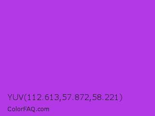 YUV 112.613,57.872,58.221 Color is a normal purple color and the nearest color is Veronica #a020f0. Hex code #b338e6 and RGB value is rgb(179,56,230). In RGB color space, this color is composed of 70% red, 22% green, 90% blue, In CMYK color space, this color is composed of 22% cyan, 76% magenta, 0% yellow , 10% black , In HSL color space, this color has a hue angle of 282° , 78% saturation and 56% lightness.