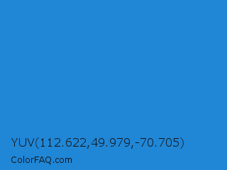 YUV 112.622,49.979,-70.705 Color is a normal blue color and the nearest color is Curious Blue #2596d1. Hex code #2086d6 and RGB value is rgb(32,134,214). In RGB color space, this color is composed of 13% red, 53% green, 84% blue, In CMYK color space, this color is composed of 85% cyan, 37% magenta, 0% yellow , 16% black , In HSL color space, this color has a hue angle of 206° , 74% saturation and 48% lightness.