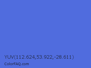YUV 112.624,53.922,-28.611 Color is a normal blue color and the nearest color is Royal Blue #4169e1. Hex code #506cde and RGB value is rgb(80,108,222). In RGB color space, this color is composed of 31% red, 42% green, 87% blue, In CMYK color space, this color is composed of 64% cyan, 51% magenta, 0% yellow , 13% black , In HSL color space, this color has a hue angle of 228° , 68% saturation and 59% lightness.