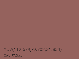 YUV 112.679,-9.702,31.854 Color is a normal red color and the nearest color is Au Chico #97605d. Hex code #95625d and RGB value is rgb(149,98,93). In RGB color space, this color is composed of 58% red, 38% green, 36% blue, In CMYK color space, this color is composed of 0% cyan, 34% magenta, 38% yellow , 42% black , In HSL color space, this color has a hue angle of 5° , 23% saturation and 47% lightness.