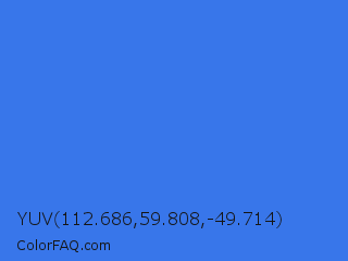 YUV 112.686,59.808,-49.714 Color is a normal blue color and the nearest color is Royal Blue #4169e1. Hex code #3876ea and RGB value is rgb(56,118,234). In RGB color space, this color is composed of 22% red, 46% green, 92% blue, In CMYK color space, this color is composed of 76% cyan, 50% magenta, 0% yellow , 8% black , In HSL color space, this color has a hue angle of 219° , 81% saturation and 57% lightness.