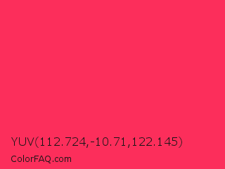 YUV 112.724,-10.71,122.145 Color is a normal red color and the nearest color is Radical Red #ff355e. Hex code #fc2e5b and RGB value is rgb(252,46,91). In RGB color space, this color is composed of 99% red, 18% green, 36% blue, In CMYK color space, this color is composed of 0% cyan, 82% magenta, 64% yellow , 1% black , In HSL color space, this color has a hue angle of 347° , 97% saturation and 58% lightness.