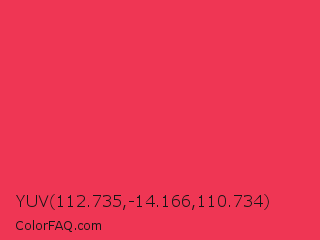 YUV 112.735,-14.166,110.734 Color is a normal red color and the nearest color is Desire #ea3c53. Hex code #ef3654 and RGB value is rgb(239,54,84). In RGB color space, this color is composed of 94% red, 21% green, 33% blue, In CMYK color space, this color is composed of 0% cyan, 77% magenta, 65% yellow , 6% black , In HSL color space, this color has a hue angle of 350° , 85% saturation and 57% lightness.