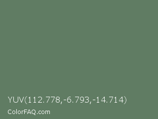 YUV 112.778,-6.793,-14.714 Color is a normal green color and the nearest color is Glade Green #61845f. Hex code #607c63 and RGB value is rgb(96,124,99). In RGB color space, this color is composed of 38% red, 49% green, 39% blue, In CMYK color space, this color is composed of 23% cyan, 0% magenta, 20% yellow , 51% black , In HSL color space, this color has a hue angle of 126° , 13% saturation and 43% lightness.