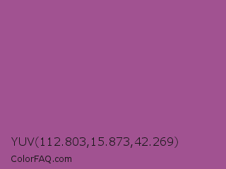 YUV 112.803,15.873,42.269 Color is a normal magenta color and the nearest color is Strikemaster #956387. Hex code #a15291 and RGB value is rgb(161,82,145). In RGB color space, this color is composed of 63% red, 32% green, 57% blue, In CMYK color space, this color is composed of 0% cyan, 49% magenta, 10% yellow , 37% black , In HSL color space, this color has a hue angle of 312° , 33% saturation and 48% lightness.