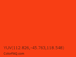 YUV 112.826,-45.763,118.548 Color is a normal red color and the nearest color is Orioles Orange #fb4f14. Hex code #f83e14 and RGB value is rgb(248,62,20). In RGB color space, this color is composed of 97% red, 24% green, 8% blue, In CMYK color space, this color is composed of 0% cyan, 75% magenta, 92% yellow , 3% black , In HSL color space, this color has a hue angle of 11° , 94% saturation and 53% lightness.