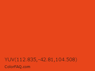 YUV 112.835,-42.81,104.508 Color is a normal red color and the nearest color is Pomegranate #f34723. Hex code #e8451a and RGB value is rgb(232,69,26). In RGB color space, this color is composed of 91% red, 27% green, 10% blue, In CMYK color space, this color is composed of 0% cyan, 70% magenta, 89% yellow , 9% black , In HSL color space, this color has a hue angle of 13° , 82% saturation and 51% lightness.