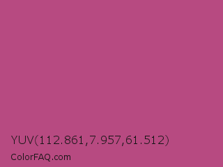 YUV 112.861,7.957,61.512 Color is a normal rose color and the nearest color is Mystic Maroon #ad4379. Hex code #b74a81 and RGB value is rgb(183,74,129). In RGB color space, this color is composed of 72% red, 29% green, 51% blue, In CMYK color space, this color is composed of 0% cyan, 60% magenta, 30% yellow , 28% black , In HSL color space, this color has a hue angle of 330° , 43% saturation and 50% lightness.